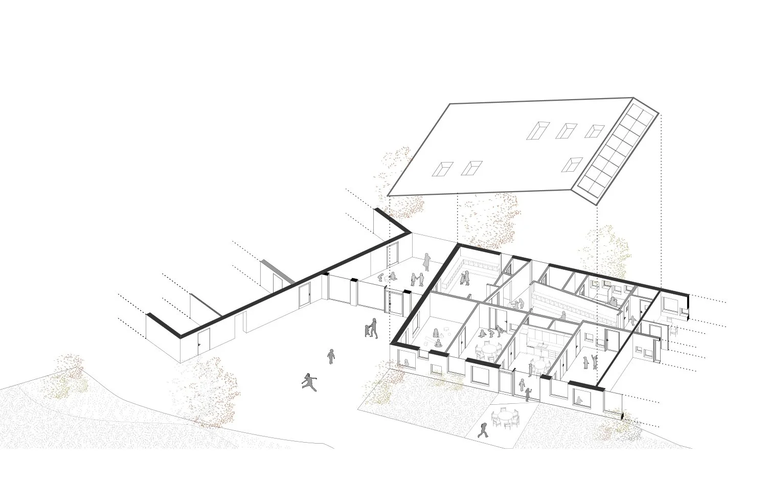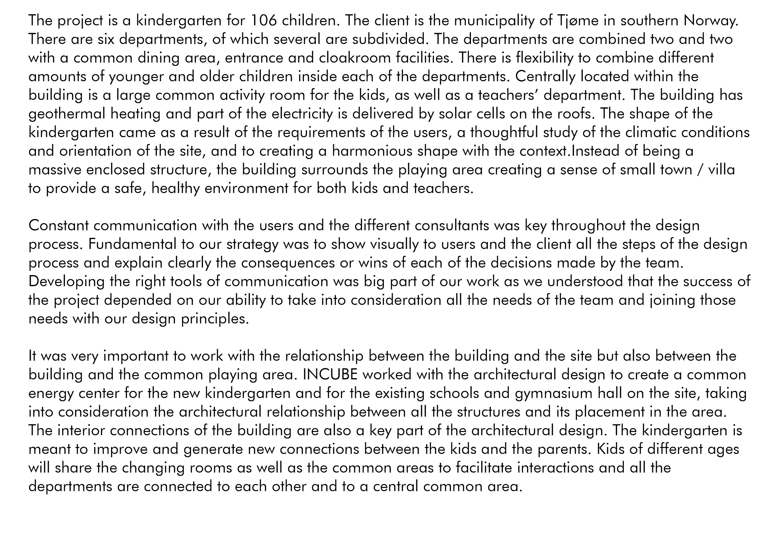 The project is a kindergarten for 106 children. The client is the municipality of Tjøme in southern Norway. There are six departments, of which several are subdivided. The departments are combined two and two with common dining area, entrance and cloakroom facilities. There will be flexibility to combine different amounts of younger and older children inside each of the departments. Central in the building is a large common activity room for the kids, as well as a teachers’ department. The building has geothermal heating and part of the electricity is delivered by solar cells on the roofs. The shape of the kindergarten came as a result of the requirements of the users, a thoughtful study of the climatic conditions and orientation of the site, and the interest for creating an harmonious shape with the context that instead from being a massive inclose structure will surround the playing area creating a sense of small town / villa to provide a safe, healthy environment for both kids and teachers.