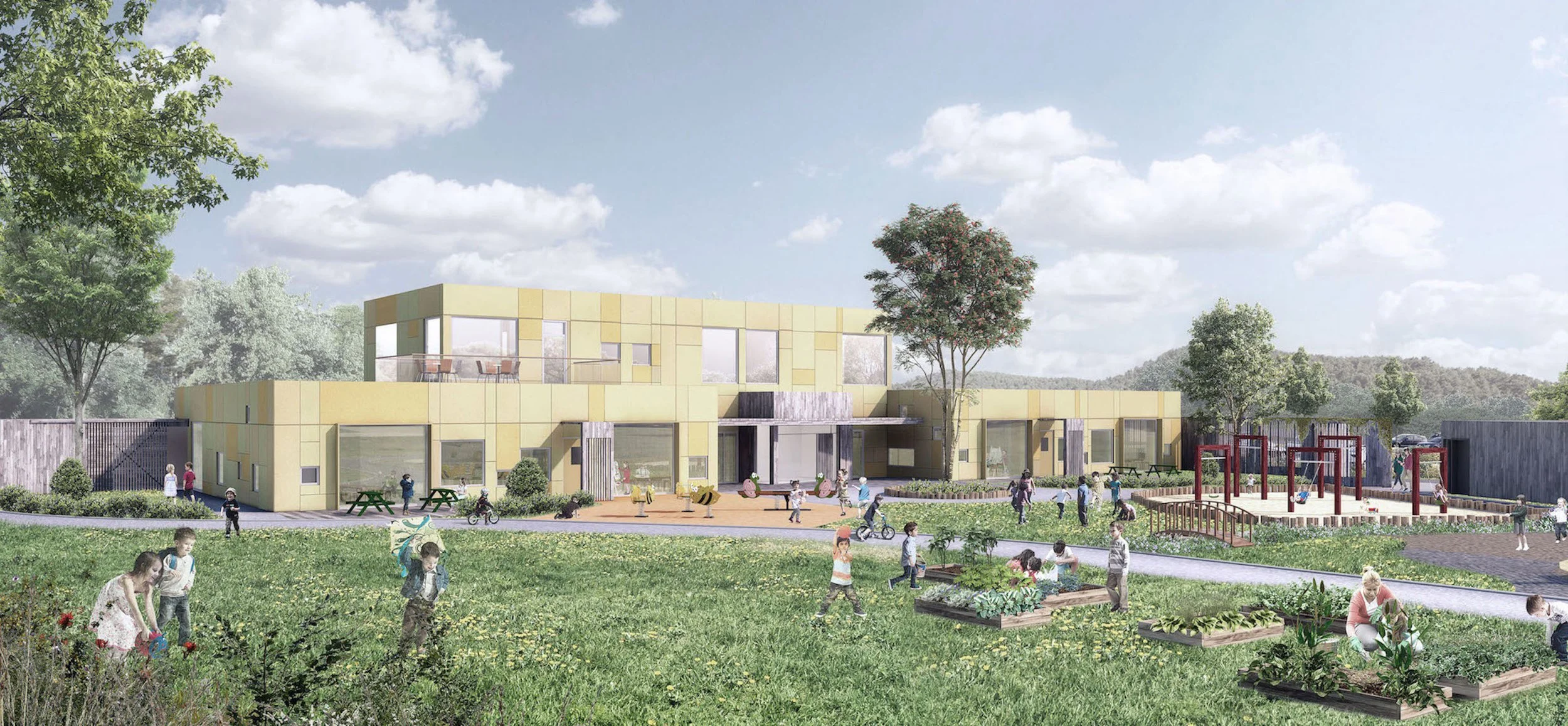 INCUBE in collaboration with Praksis Arkitekter AS and Skanska was selected as one of three groups after the pre-qualification competition for a new kindergarten and primary school at Mære in Trøndelag. The school and kindergarten, together with the existing sports facility and community center, will be the village’s most important meeting place. The proposal emphasizes proximity between the buildings in order to form a central meeting point towards an access square. On the opposite side of the buildings, the facilities open up with its play areas facing nature with woods and meadows.